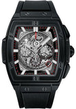 51 x 45 mm microblasted black ceramic case, microblasted black ceramic bezel with 6 H-shaped titanium screws, sapphire crystal with anti-reflective treatment, sapphire dial, HUB4700 self-winding movement, approximately 50 hours of power reserve, black structured lined rubber strap, black-plated titanium deployant buckle. Water resistant to 50 meters.