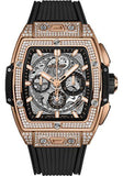 42 mm polished 18k king gold case set with 166 diamonds, polished 18K king gold bezel set with 164 diamonds totaling 0.90ct with, 6 H-shaped titanium screws, sapphire crystal with anti-reflective treatment, sapphire dial, HUB4700 self-winding skeleton chronograph movement, approximately 50 hours of power reserve, black structured lined rubber strap, 18K king gold and black-plated titanium deployant buckle. Water resistant to 100m (10 ATM).