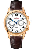 39 mm pink gold case, scratch-resistant sapphire crystal anti-reflective treatment inside, Omega 3203 manual-winding movement with column wheel mechanism and co-axial escapement, chronometer, approximately 55 hours of power reserve, brown leather strap. Water resistant to 3 bar (30 metres / 100 feet).