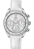 Omega Speedmaster 38 Co-Axial Chronograph Watch - 38 mm Steel Case - Dual Diamond Bezel - Mother-Of-Pearl Diamond Dial - White Leather Strap - 324.38.38.50.55.001