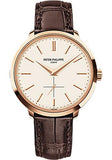38mm 18K rose gold case, sapphire-crystal back, silvery opaline dial with gold applied hour markers, caliber 215 PS manually wound movement with seconds subdial, matt dark brown alligator strap with square scales, prong buckle. Water resistant to 30 m.