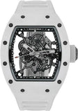 49.9 x 42.7 mm white ATZ ceramic case, sapphire back, grade 5 titanium crown with collar in Alcryn, sapphire crystal with anti-glare treatment on both sides, skeleton dial, calibre RMUL2 manual winding movement with hours, minutes, and seconds, approximately 55 hours of power reserve, white rubber strap.