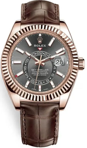 Rolex Sky-Dweller Rose Gold Dark Rhodium Index Dial Fluted Bezel Leather Strap 326135
