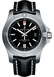 44.00 mm steel case, 11.25 mm thick, screw-locked crown with two gaskets, unidirectional ratcheted bezel, sapphire crystal with glareproof treatment on both sides, volcano black dial, Breitling 17 self-winding movement with calendar via dial aperture, approximately 38 hours of power reserve, black leather strap, tang buckle. Water resistant to 200 m (660 ft).
