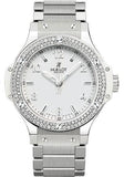 38mm stainless steel case, stainless steel bezel set with 126 diamonds (0.87ct), white composite resin lateral inserts and bezel lugs, white dial, quartz HUB 2900 movement, stainless steel bracelet. Water resistant to 100 meters.
