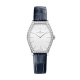 Measuring a sleek 34.4 x 28.4 mm, the 18K White gold case encapsulates the essence of luxury. The White Dial, adorned with an Analog display, serves as a canvas for this horological masterpiece. Every glance at the watch is an appreciation of refinement and precision.