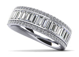 This item features exclusively high-quality natural diamonds, ensuring superior quality and ethical sourcing. For more information about the diamond quality, please do not hesitate to contact us. This stunning diamond anniversary ring features 21 perfectly cut baguette diamonds in the center set and 54 brilliant cut round diamonds on the sides. The effect is spectacular. Customize this ring by selecting the type of metal, diamond quality and size.