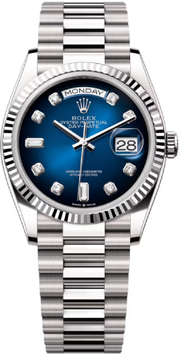 Rolex Day-Date 36 White Gold Blue Ombre Diamond Dial & Fluted Bezel President Bracelet 128239