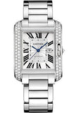 Medium size (39.2mm x 29.8mm) rhodiumized 18K white gold case set with brilliant-cut diamonds, nine-sided crown set with a brilliant-cut diamond, sapphire crystal, slivered and lacquered flinque dial with Roman numerals and sword-shaped blued-steel hands, self-winding caliber Cartier 077 movement, rhodiumized 18K white gold bracelet. Water resistant to 30 meters.