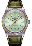 36.0 mm stainless steel (gem-set) case, 10.0 mm thick, non screw-locked crown with two gaskets, unidirectional ratcheted bezel, mint green dial, Breitling 10 self-winding movement, approximately 42 hours of power reserve, green alligator leather strap, folding buckle. Water resistant to 100 m (330 ft).