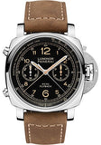 44mm AISI 316L polished steel case, polished steel bezel, black dial with luminous arabic numerals, chronograph counter at 3 o'clock, small seconds at 9 o'clock and central chronograph seconds and minute hands, P.9100 calibre automatic movement with hours, minutes, small seconds, date, chronograph flyback, seconds reset, approximately 3 days of power reserve, dark brown scamosciato strap with beige stitching. Water resistant to 10 bar (~100 metres).