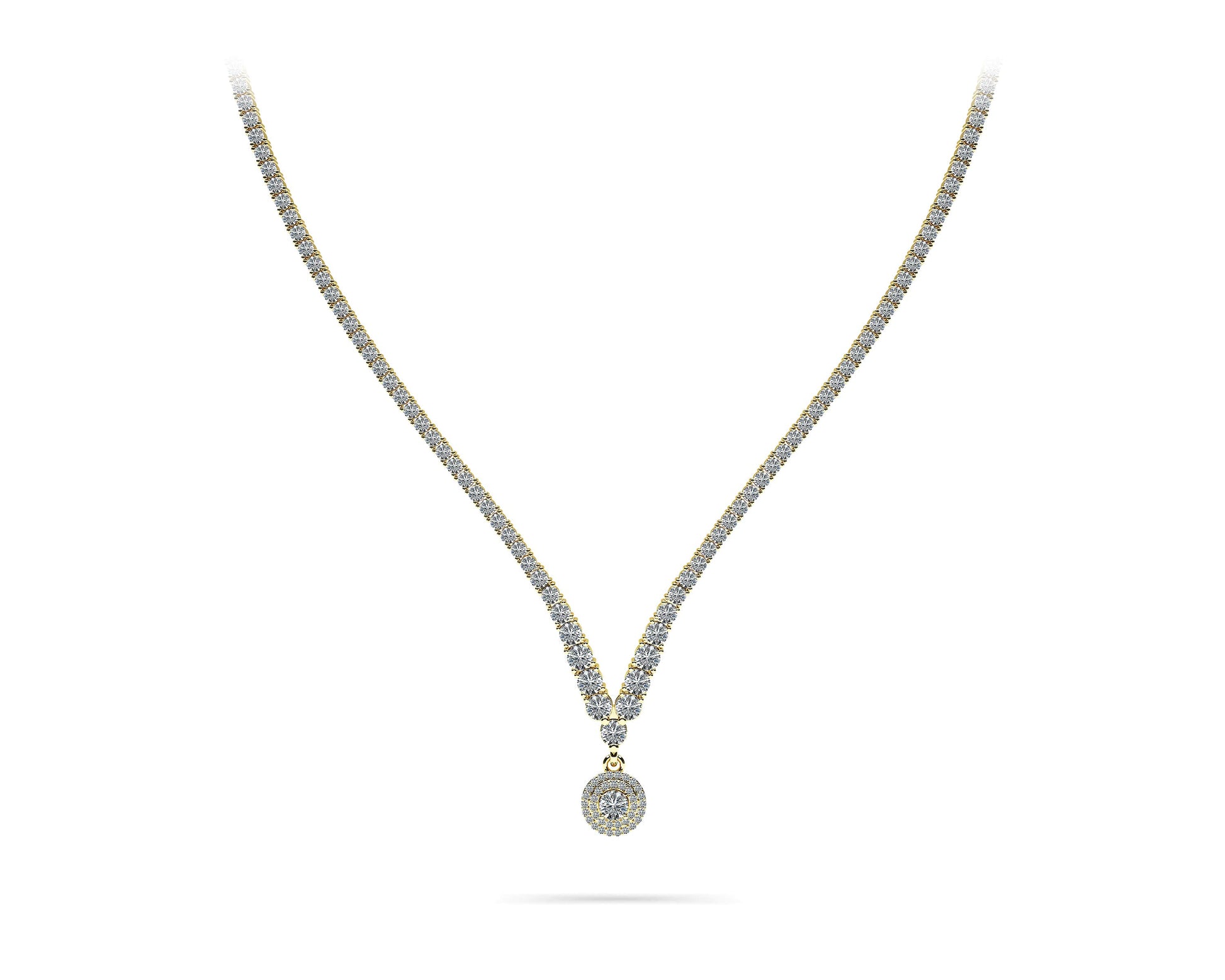 The item exclusively features Lab-Grown Diamonds in FG/VS quality, ensuring premium quality and ethical sourcing. For any inquiries regarding the quality of the stones, please feel free to contact us. Inspired by modern elegance and timeless design, this remarkable plunging v-neck diamond necklace is a delightful statement piece that is guaranteed to catch attention. Brilliant round diamonds graduate perfectly in a v-shape around the neck to lead the eye to the endless circular diamond halo pendant, which completes the look. Set in gold or platinum in a four-prong setting, this stunning piece is the ultimate expression of opulence and luxury.