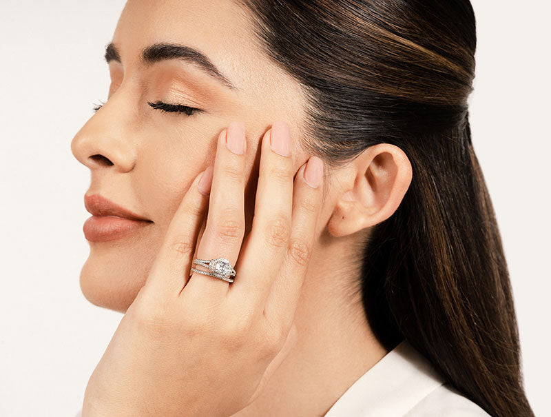 The item exclusively features Lab-Grown Diamonds in FG/VS quality, ensuring premium quality and ethical sourcing. For any inquiries regarding the quality of the stones, please feel free to contact us. The beautiful details of this cushion cut bridal set will surely leave her breathless. This set features a cushion cut center diamond with a split shank and diamonds that are effortlessly wrapped around the sides of the shanks and a matching band. Customize this beautiful ring by selecting the metal type, center diamond, side diamond quality and ring size.